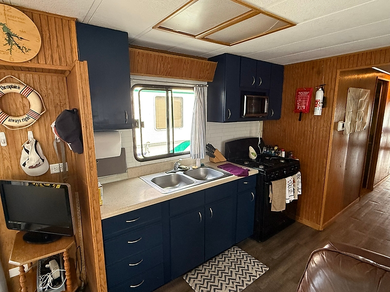 Full galley equipped with full size oven range, full-size refrigerator with freezer, microwave and double stainless sink. Built-in kitchen cabinet storage space. Dining/Picnic style table and seating.